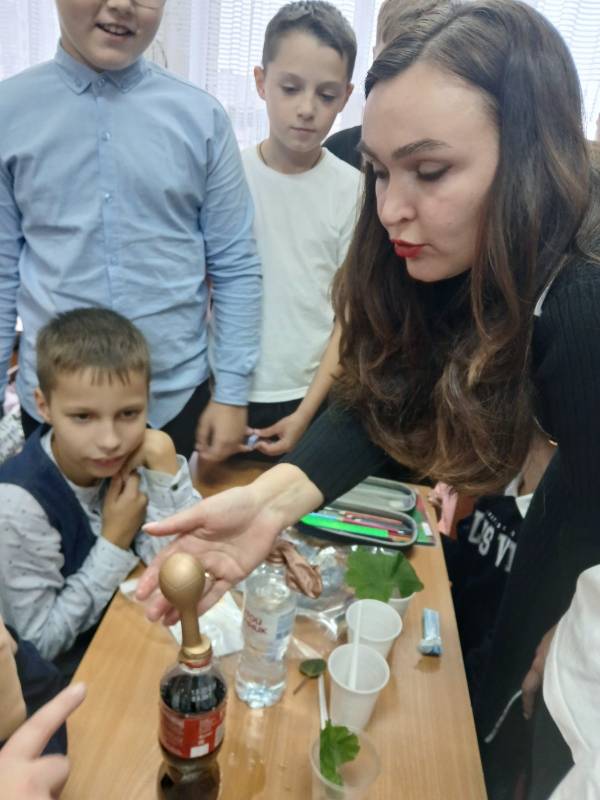 С помощью опытов инструктор-валеолог доказала учащимся отрицательное влияние газированных напитков на организм подрастающего поколения.